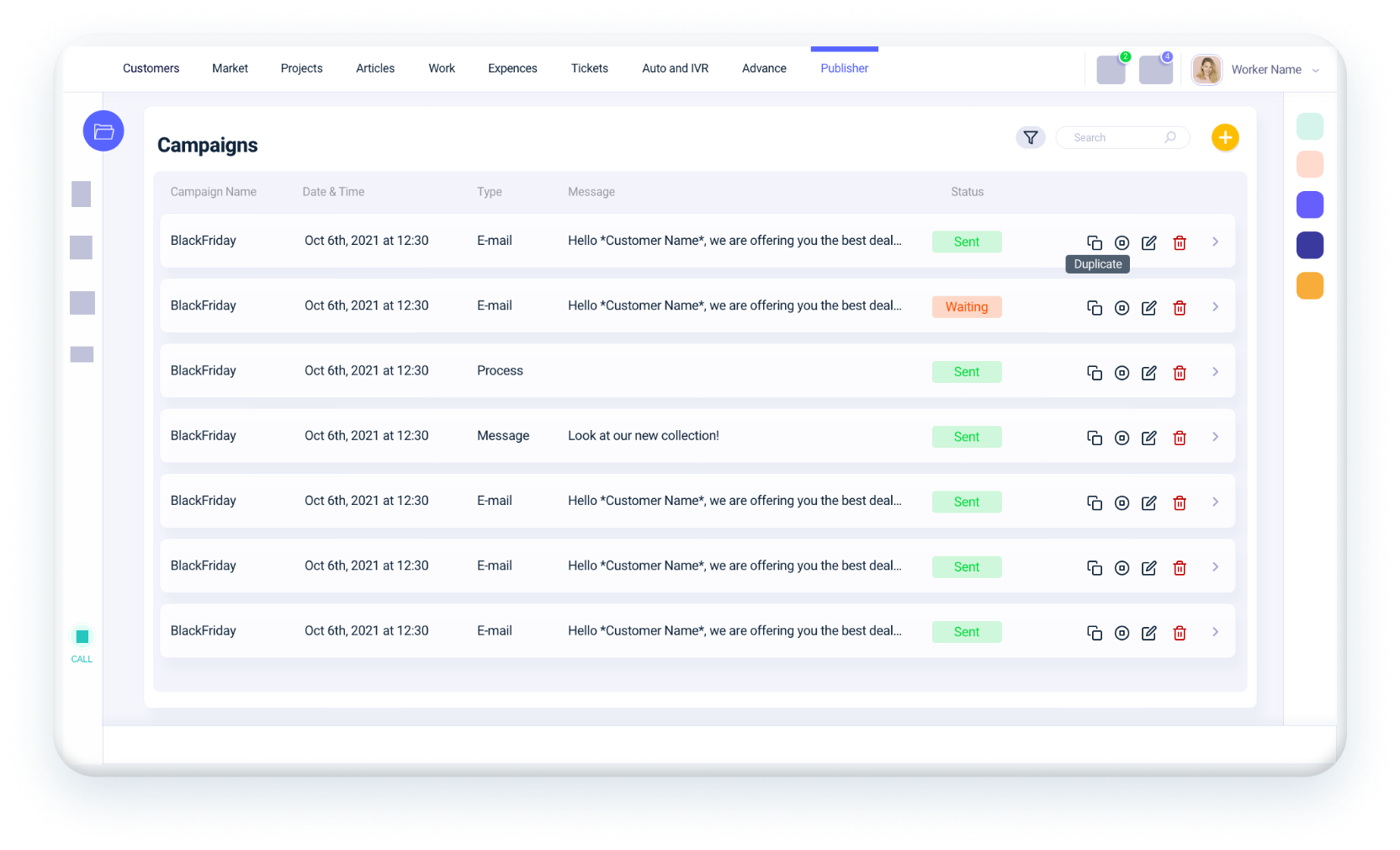 המערכת החכמה שלנו מאפשרת להקים קמפיינים אוטומטיים מותאמים לסוג פרוייקט אפיון לקוח ולכל צורך אחר שעולה בעסק שלך. קמפיין מאפשר הקמת מערך הודעות בתזמון אוטומטי (ב SMS או במייל) ללקוח, קבלת משובים על עסקאות ועוד הרבה יותר. ההודעות בקמפיין יכולות להיות מתוזמנות על פי לוח זמנים ידוע מראש, או ביחס לפעולות מסוימות המתבצעות על ידי הלקוח או המשרד. באופן הזה לקוח יכול להרגיש את תשומת הלב המירבית המגיעה לו, ולך להתנהל באופן חכם ויעיל הרבה יותר.