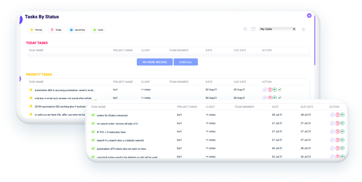 באמצעות המערכת תוכל לנהל מעקב חי אחר כל פרויקט. משלב החתימה הדיגיטלית, דרך כל ההתקשרות מול הלקוח מצד המשרד, קבלת תשלומים, שליחת הודעות, משימות, מסמכים וכו'- הכל מתאפשר ישירות מתוך המערכת שלנו. המערכת היא בהתאמה אישית, כך שניתן בקלות ובמהירות להציג נתונים מלאים לגבי הלקוחות בכל אופן בו תבחר.