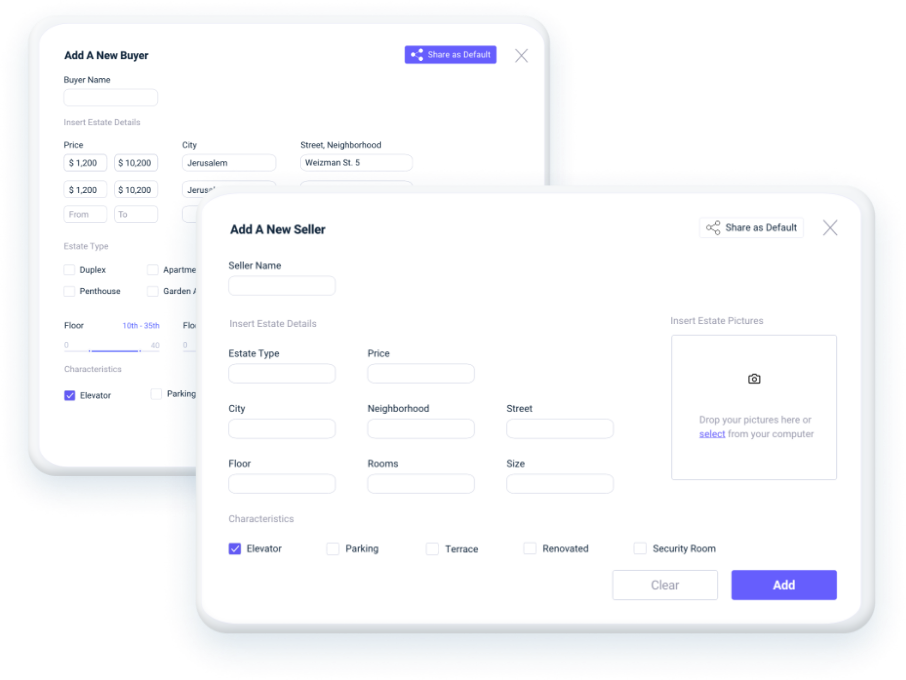 השוואת צרכי הקונה ופרטי הנכסים המוצעים בצורה שקופה ונוחה עבורך ועל ידך לקונה. המערכת החכמה שלנו מאפשרת לך לנהל את כלל תהליך התיווך במקום אחד- פרטים מלאים לגבי הקונה והמוכר העתידיים- כולל פרטי הנכס המלאים, דרישות הקונה המדויקות, תמונות, מחירים, מפרטים, גודל הנכס, מיקום ועוד.