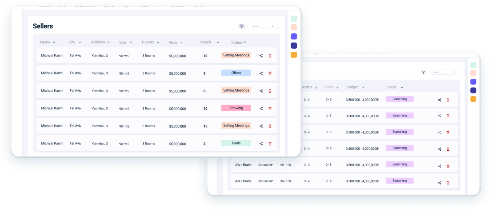 המערכת החכמה מאפשרת לנהל את תהליך ההתאמה של נכס לקונה פוטנציאלי באופן שקוף ומדויק בשבילך. המערכת מציגה את פרטי הנכס המלאים בצמוד לכל הקונים הפוטנציאלים. נהל את התקשורת שלך עם הלקוחות, יומן הפגישות וכל המידע הדרוש לקדם את המכירה ישירות מתוך המערכת.