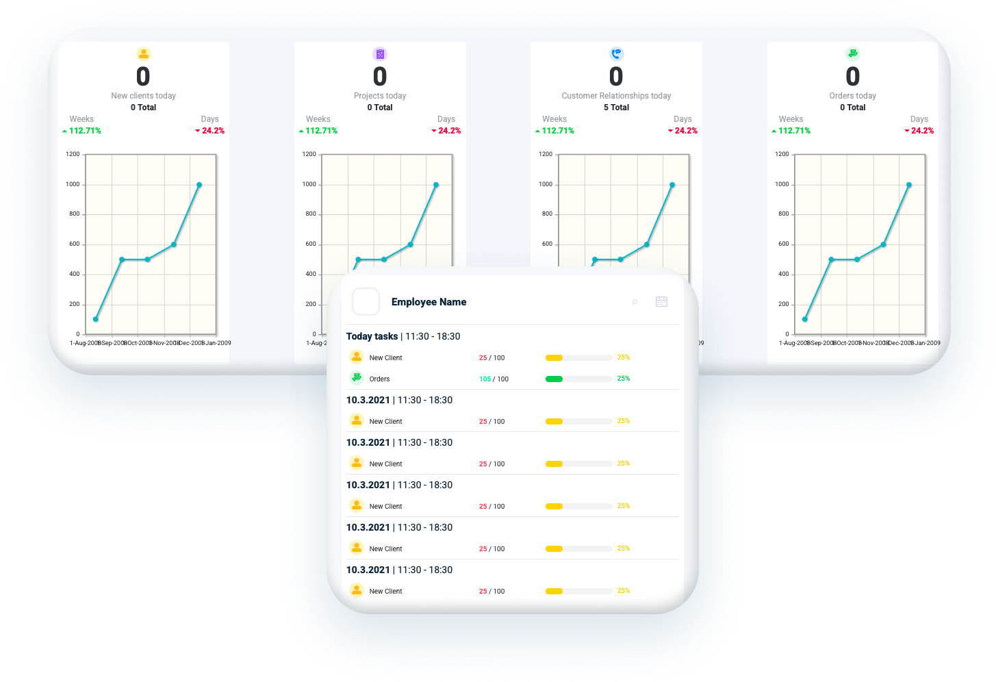לוח הבקרה הוא הבית שלך בניהול היום יומי השוטף של מערך הטלמרקטינג. באמצעות עריכה והתאמה אישית של הלוח כך שיציג את הנתונים החשובים עבורך תוכל בלחיצת כפתור להתחבר לכל מה שנעשה בכל רגע נתון בעסק: תצוגה חודשית שבועית או יומית של מכירות, צפייה רוחבית בפרויקטים פעילים, הישגי עובדים, ניהול מלאי ועוד הרבה יותר- הכל בתצוגה גרפית נעימה וברורה. לוח הבקרה שלנו תוכנן במיוחד בכדי להקל ולשפר לך את הניהול השוטף.